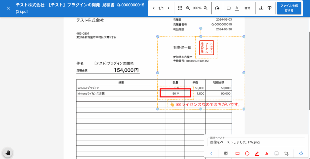 画像ファイルやPDFファイルにkintone上で書き込みができてしまうプラグインです。